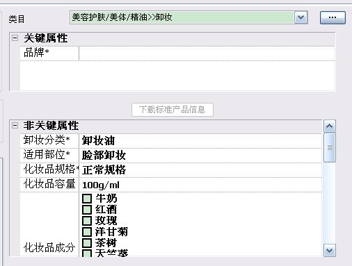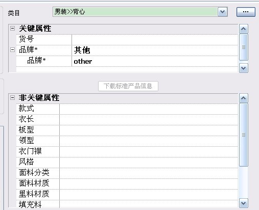 使用我们软件下载这个宝贝,导入淘宝助理,属性区域的显示情况:(可以看到品牌是带*号的必填属性,由于上面宝贝页面缺少这个属性,所以下面这里也是显示为空)