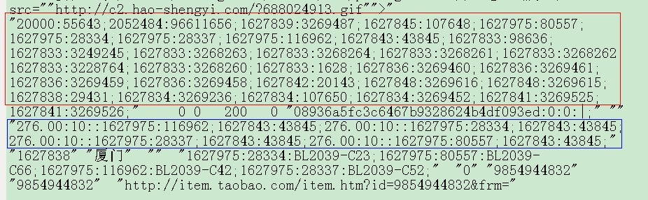 上面的红框部分是 宝贝属性,蓝框是 销售属性组合,可以看出 销售属性组合 每行数据都多出一个值对,比如:276.00:10::1627975:116962;1627843:43845; ——>1627975:116962;表示 颜色;1627843:43845; 表示 镜架颜色。这个是怎么看出来的?可以对比前后几行数据查看,这个 镜架颜色 是固定的,其它几种颜色 是变化值,因此可以断定。