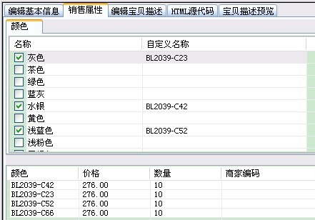 使用我们软件下载这个宝贝,导入淘宝助理,销售属性区域的显示情况(新的结构只有 颜色 一种类型):