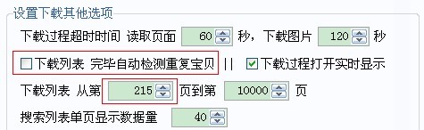 使用下载软件抓取重复宝贝,为了方便查找,我们从第215页开始“下载列表”,首先在软件选项先设置一下: