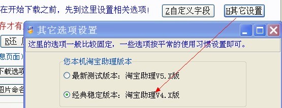 淘宝助理已经使用了5.X版本的朋友如想换回4.X,宝贝下载软件里面“选项—>其它设置(右上角)”,可以修改助理的版本,改好之后请重新“下载宝贝”。