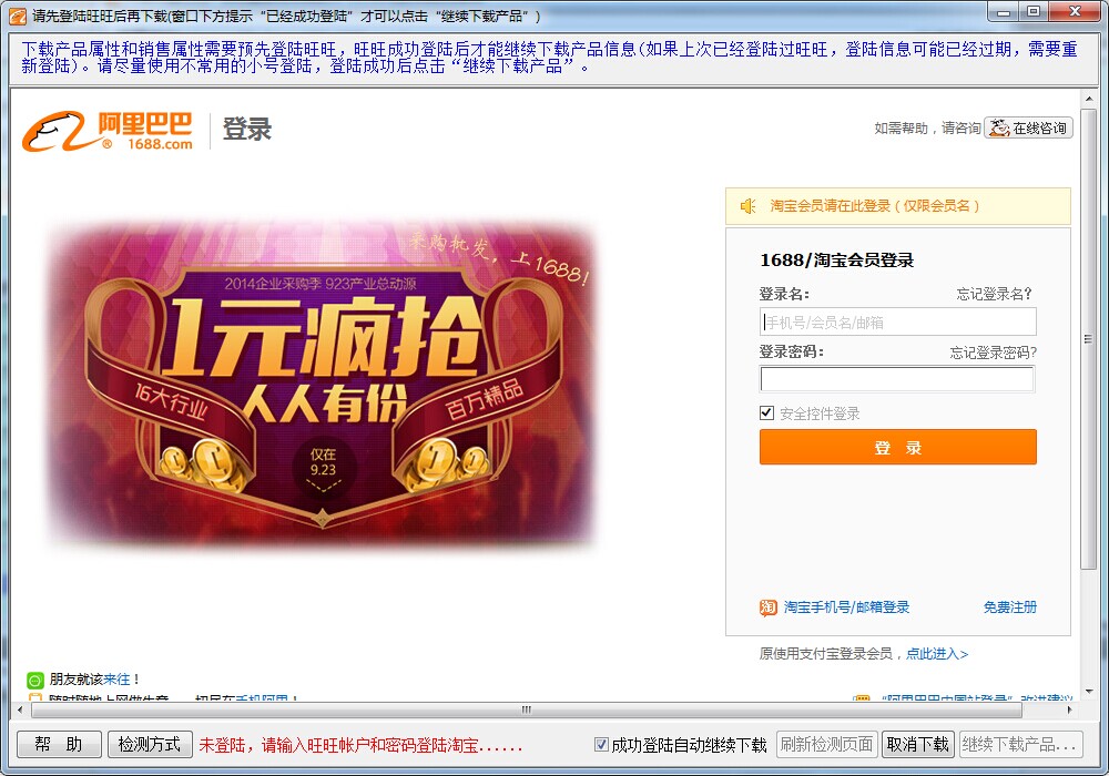 —>第四步:登陆旺旺,下载产品属性需要这一步,第一次下载该窗口会自动弹出,保存了登陆信息,下次下载产品将自动跳过。