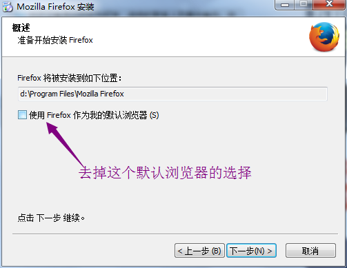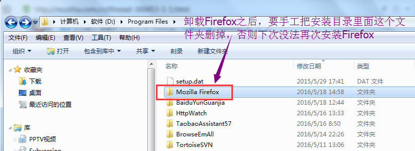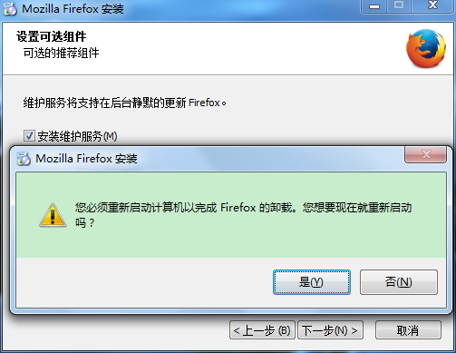 即使您重启了系统了,再次安装也会出现这个提示,解决方法是手工找到上次Firefox卸载之后残留的文件夹,把它删掉就可以了,不需要再重启系统。