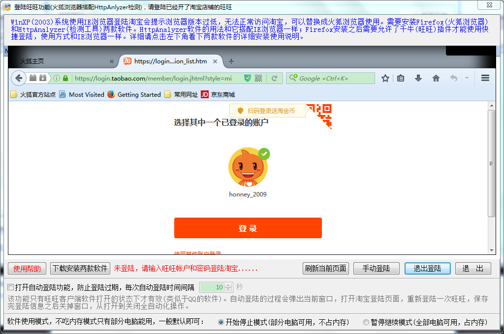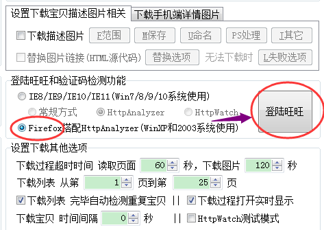 两个软件都安装好之后,打开宝贝下载软件,进入“选项(右下角)—>Firefox搭配HttpAnalyzer(WinXP和2003系统使用)—>登陆旺旺”,如果没有任何错误提示,能够正常打开登陆窗口,则表示Firefox软件已经可以正常使用。