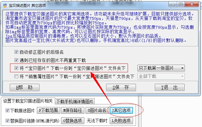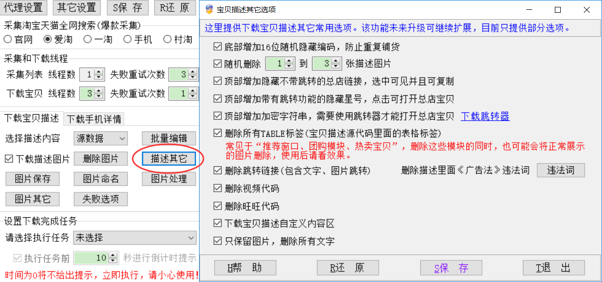 删除跳转链接(包含文字、图片跳转):如果下载的宝贝描述里面包含了很多链接,顾客浏览时点击将会跳转到原来的店铺,这样会影响正常销售,选上该项能将附在文字、图片上面的跳转链接通通去掉;
