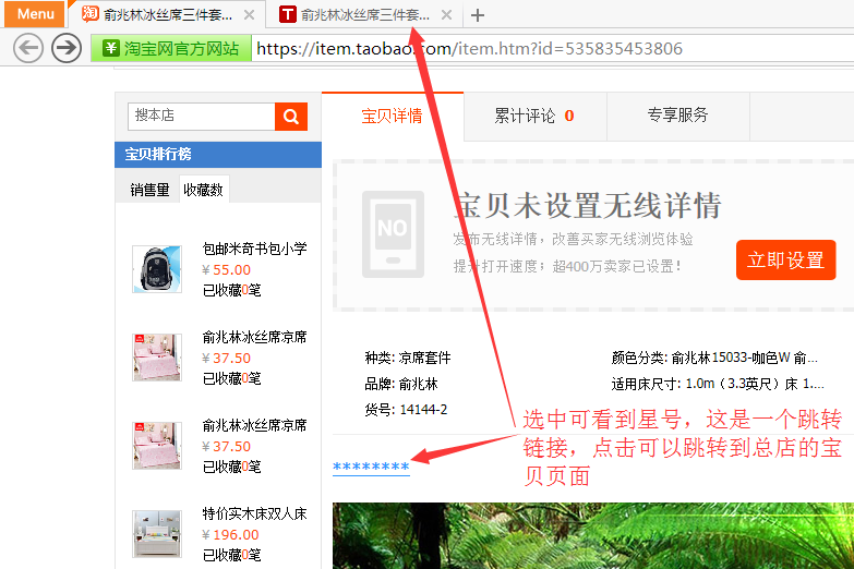在宝贝描述顶部增加带有跳转功能的隐藏星号,点击可打开总店宝贝:这是带跳转的总店隐藏链接,相当于在宝贝描述开头添加了下面的这段代码,可以在宝贝描述批量编辑—>首尾添加内容加进来,效果一样。