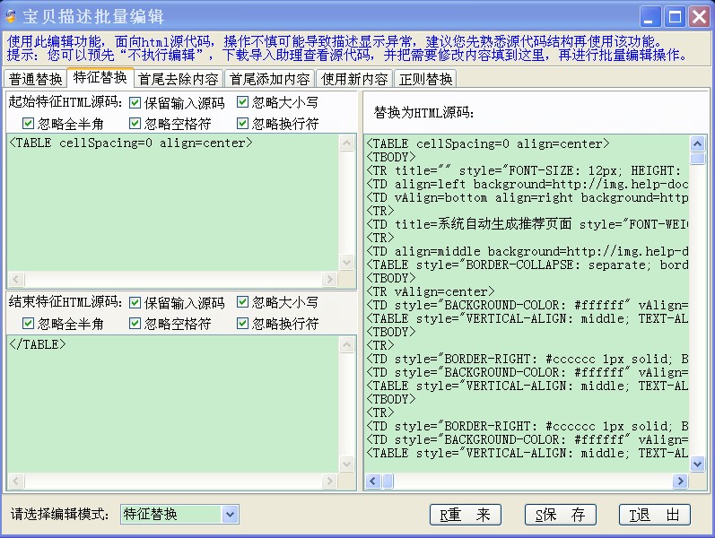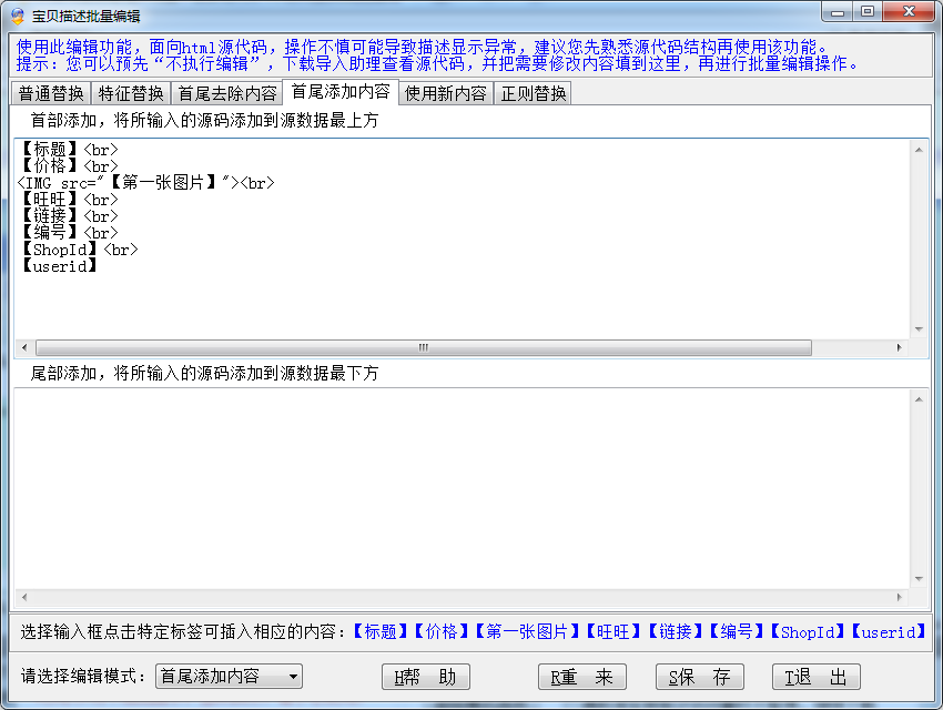 提示:您可以预先"不执行编辑",将宝贝下载之后导入助理查看源代码,并把需要修改的内容填到这里,再进行批量编辑操作。