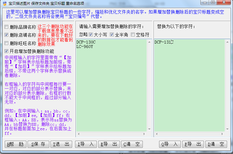 这里可以增加替换删除宝贝标题的一些字符,缩短和优化文件夹的名字。如果增加替换删除后的宝贝标题变成空的,二级文件夹名称将会使用“宝贝编号”代替,详细使用请看下宝贝标题增加替换删除功能。