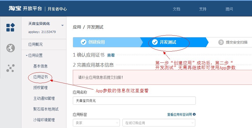 点击应用证书可查看APP参数: