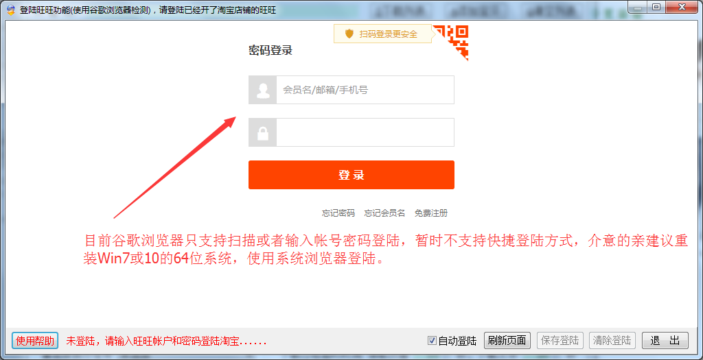 谷歌浏览器目前只支持手机扫描二维码或者输入帐号密码登陆,自动保存登陆信息,自动关掉弹出窗口,暂时不支持快捷登陆方式,介意的亲建议重装Win7或者10的64位系统,使用系统IE浏览器登陆。