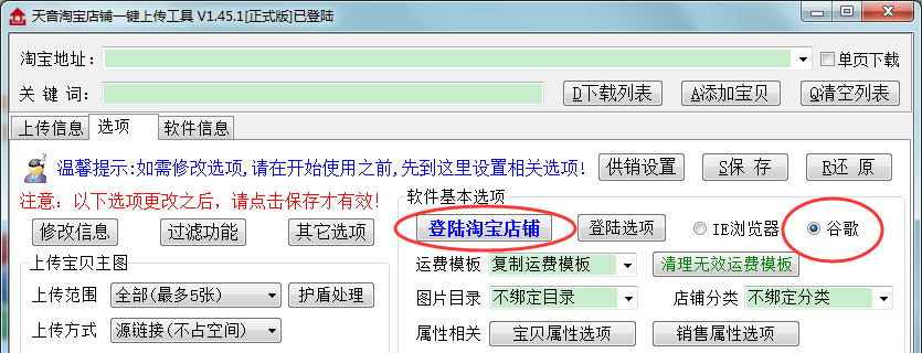 目前使用WinXP的系统IE浏览器登陆淘宝,淘宝会建议您换用谷歌、火狐或者是UC浏览器。天音软件选用谷歌浏览器代替系统的IE浏览器。如果是XP系统,只要下载谷歌浏览器所需要的文件放到天音目录下解压,然后在选项里面选择谷歌方式登陆就可以了。