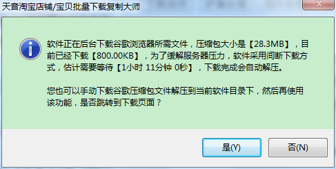 谷歌浏览器的下载有两种方式,一种是只要打开天音软件,谷歌压缩包在后台自动安静下载,不会影响到软件其它操作。老虑到目前用户较多,为了缓解服务器压力,软件采用间断下载方式,下载过程大概需要一小时左右,下载完成会自动解压;