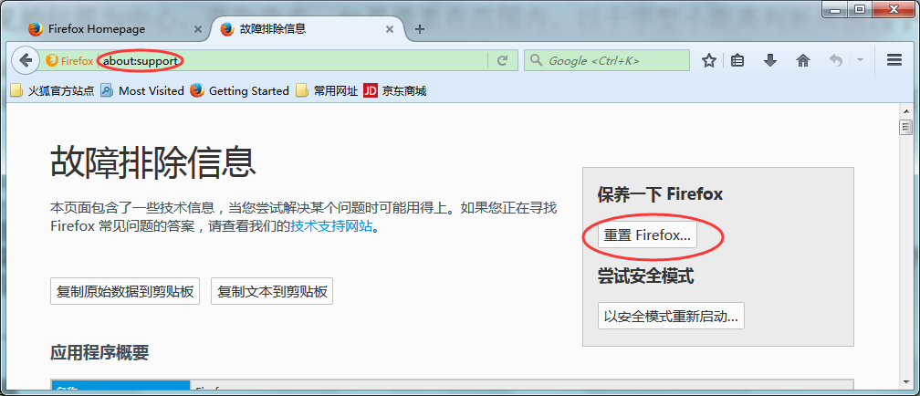 打开火狐浏览器,在网址栏输入“about:support”