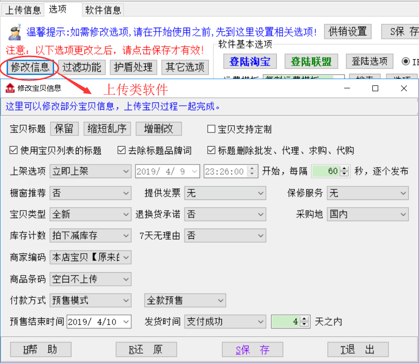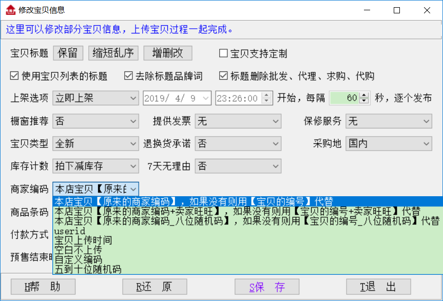 这里可以修改部分宝贝信息,下载宝贝过程一起完成。该功能可扩展,目前只提供部分可供更改的信息,大部分功能淘宝助理已经提供,这里不再重复。里面的几个主要功能参见下面的使用帮助: