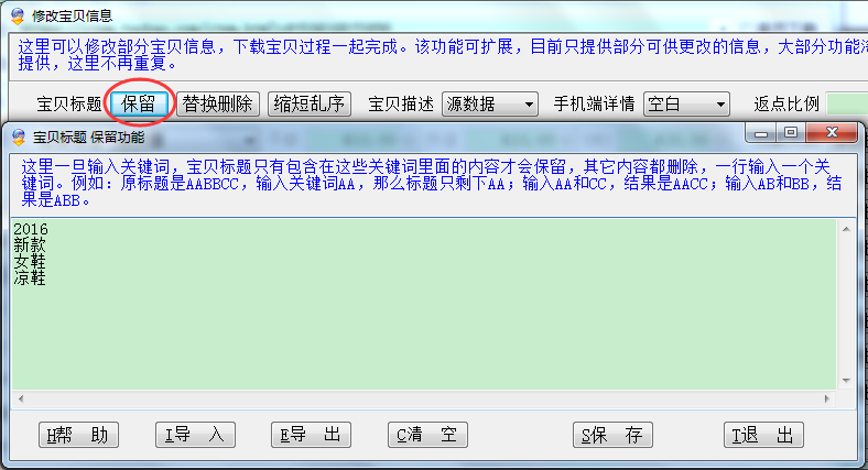 这里一旦输入关键词,宝贝标题只有包含在这些关键词里面的内容才会保留,其它内容都删除,一行输入一个关键词。例如:原标题是AABBCC,输入关键词AA,那么标题只剩下AA;输入AA和CC,结果是AACC;输入AB和BB,结果是ABB。