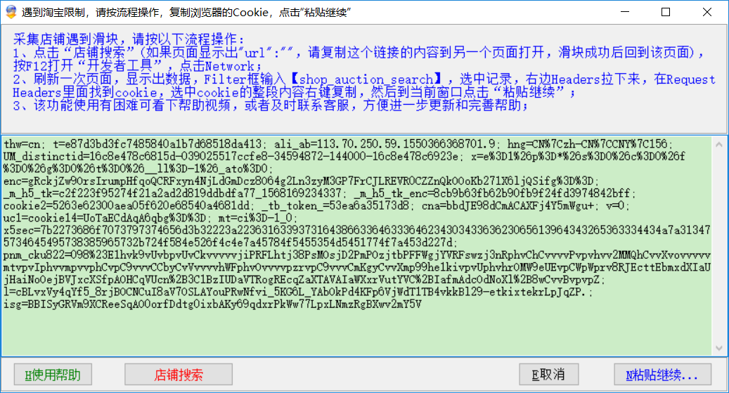 —>第二步:刷新一次页面,显示出数据,Filter框输入【shop_auction_search】,选中记录,右边Headers拉下来,在Request Headers里面找到cookie,选中cookie的整段内容右键复制,然后到当前窗口点击“粘贴继续”;