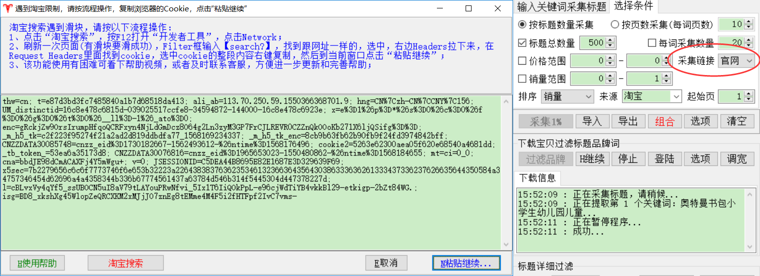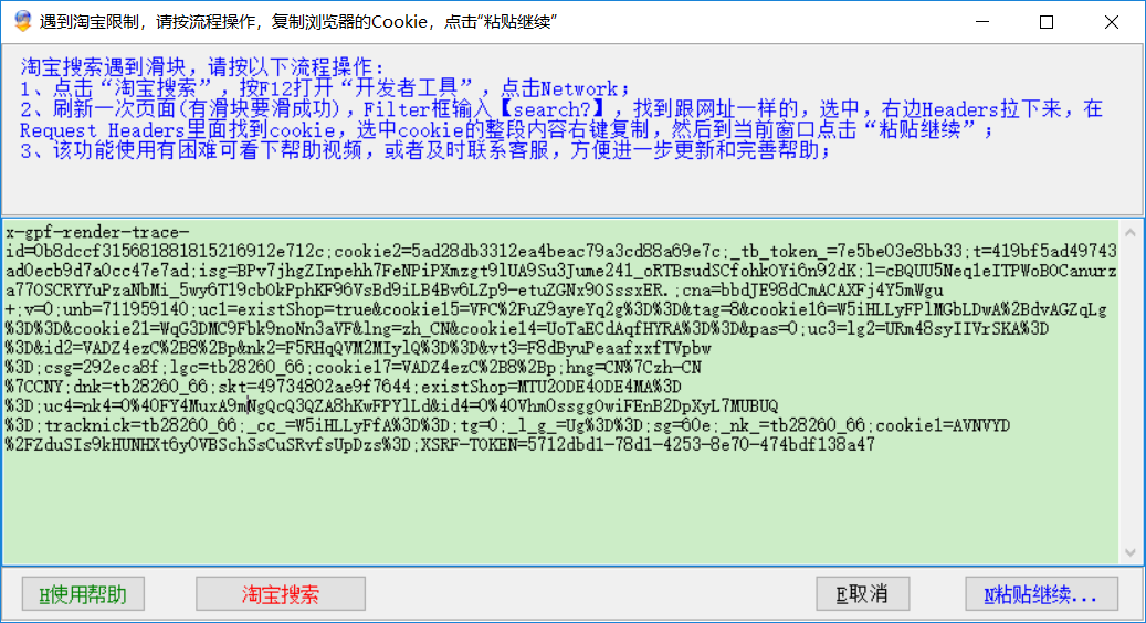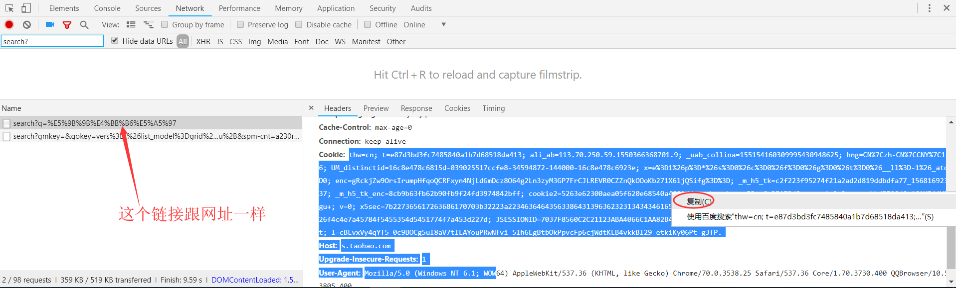 —>第二步:刷新一次页面(有滑块要滑成功),Filter框输入【search?】,找到跟网址一样的,选中,右边Headers拉下来,在Request Headers里面找到cookie,选中cookie的整段内容右键复制,然后到当前窗口点击“粘贴继续”;