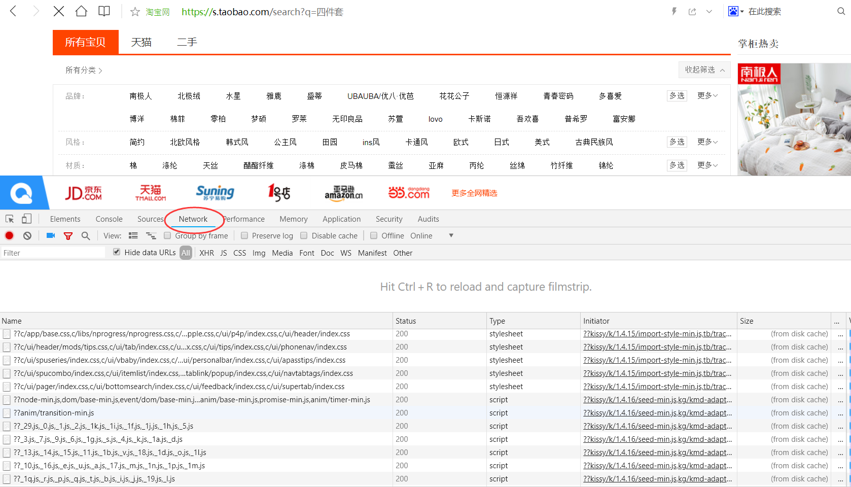 —>第一步:点击“淘宝搜索”,按F12打开“开发者工具”,点击Network;
