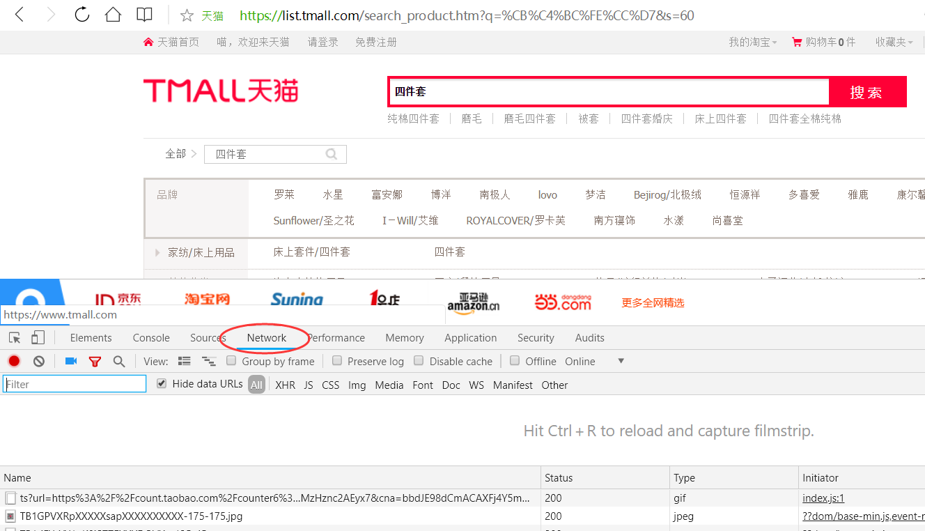 —>第一步:点击“天猫搜索”,按F12打开“开发者工具”,点击Network;