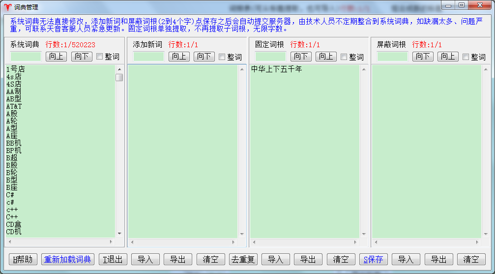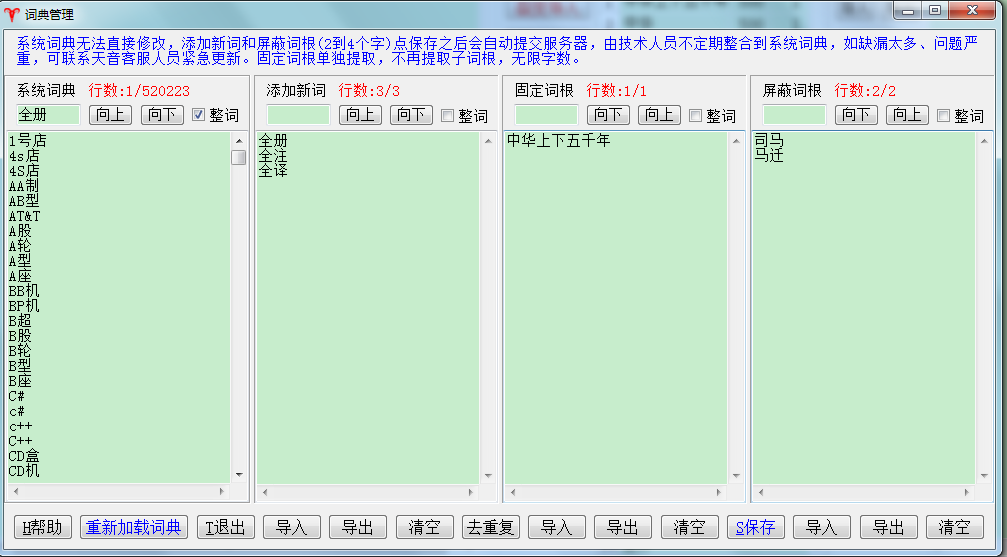 添加新词:必须是系统词典缺少的词汇,长度2到4个字。保存时,软件会删除新词里面系统词典已有的部分。