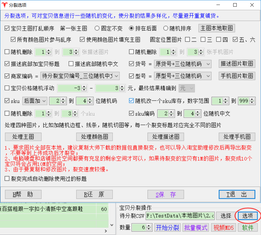 该选项内容可对宝贝信息进行一些随机的变化,使分裂的结果多样化,尽量避开重复铺货。