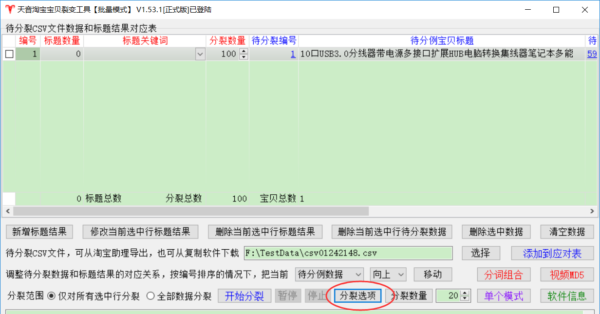 —>打开裂变工具,右下角待分裂CSV文件,选择刚刚下载的CSV文件;