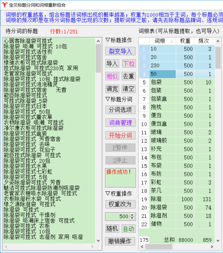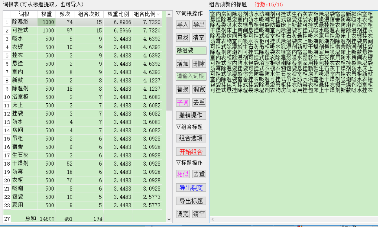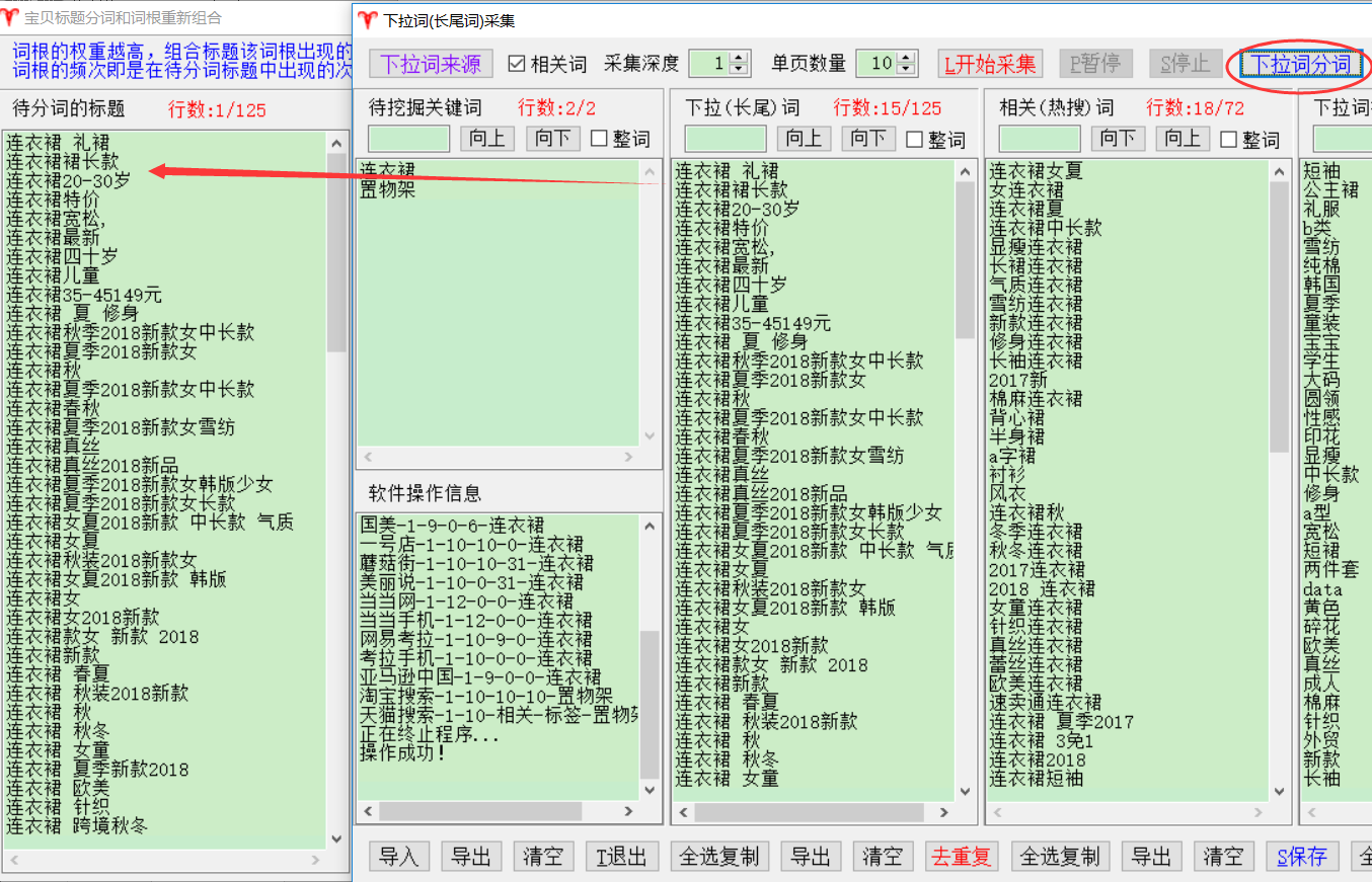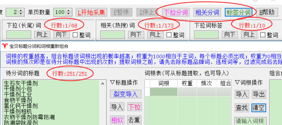 采集完下拉词,点一下“下拉词分词”,可将下拉词转入分词组合功能里面的待分词标题