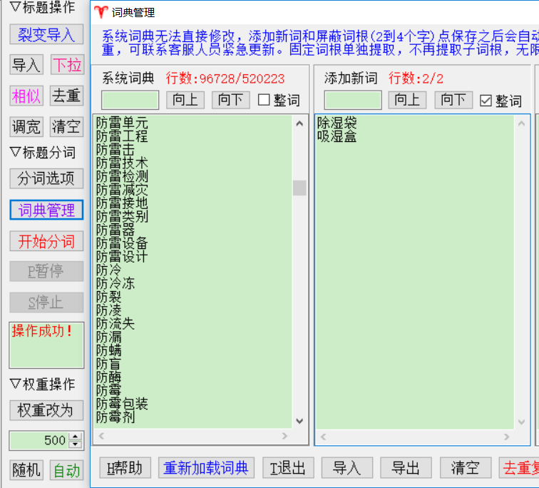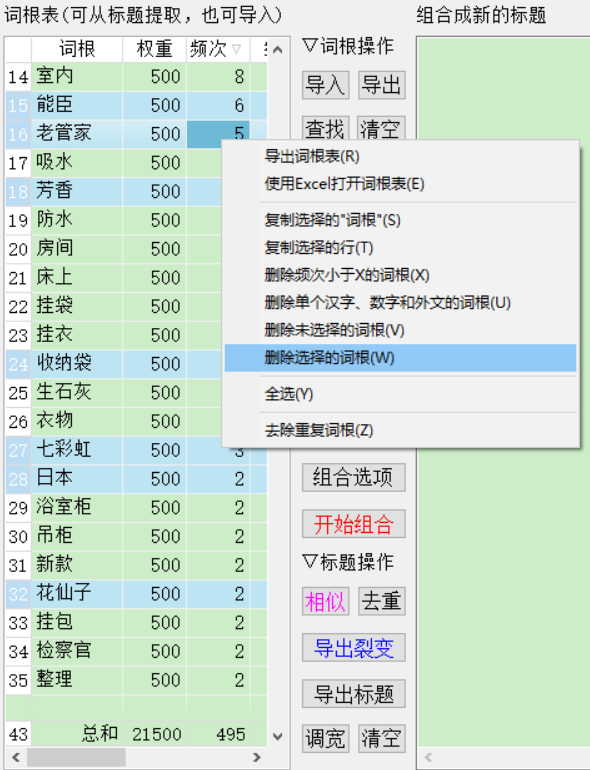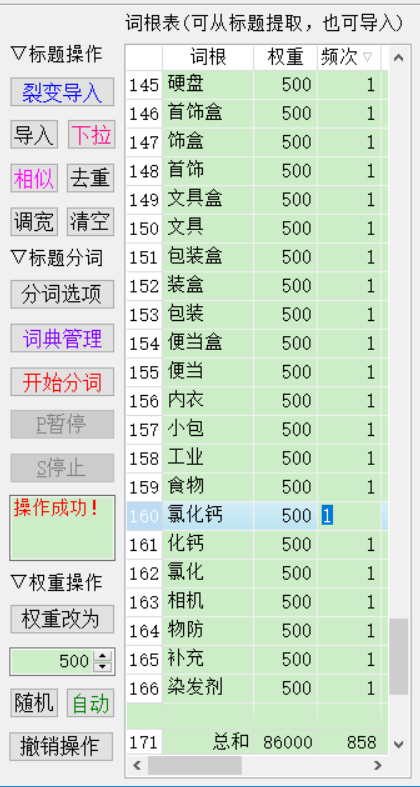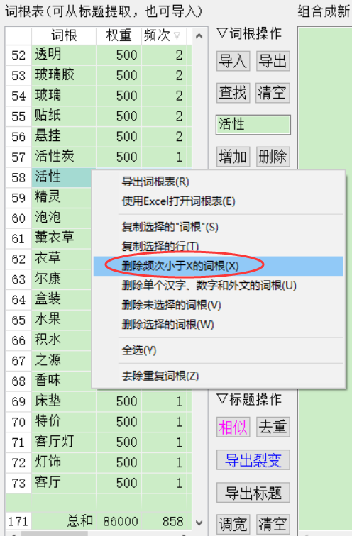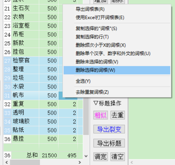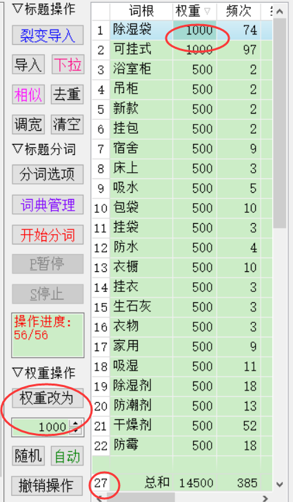 点击频次排序,发现频次为1的词根占大多数,我们可以先把频次为1的词根里面跟除湿袋有关的词根的频次改成2,然后再把频次为1的词根删除,避免误删