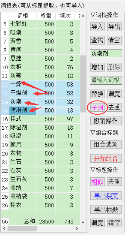 这一步不能在刚生成词根时做,尽量在删除低频次词根之后做,比如频次为1的词根“除湿袋子”,会将频次为100的“除湿袋”主词根删除。