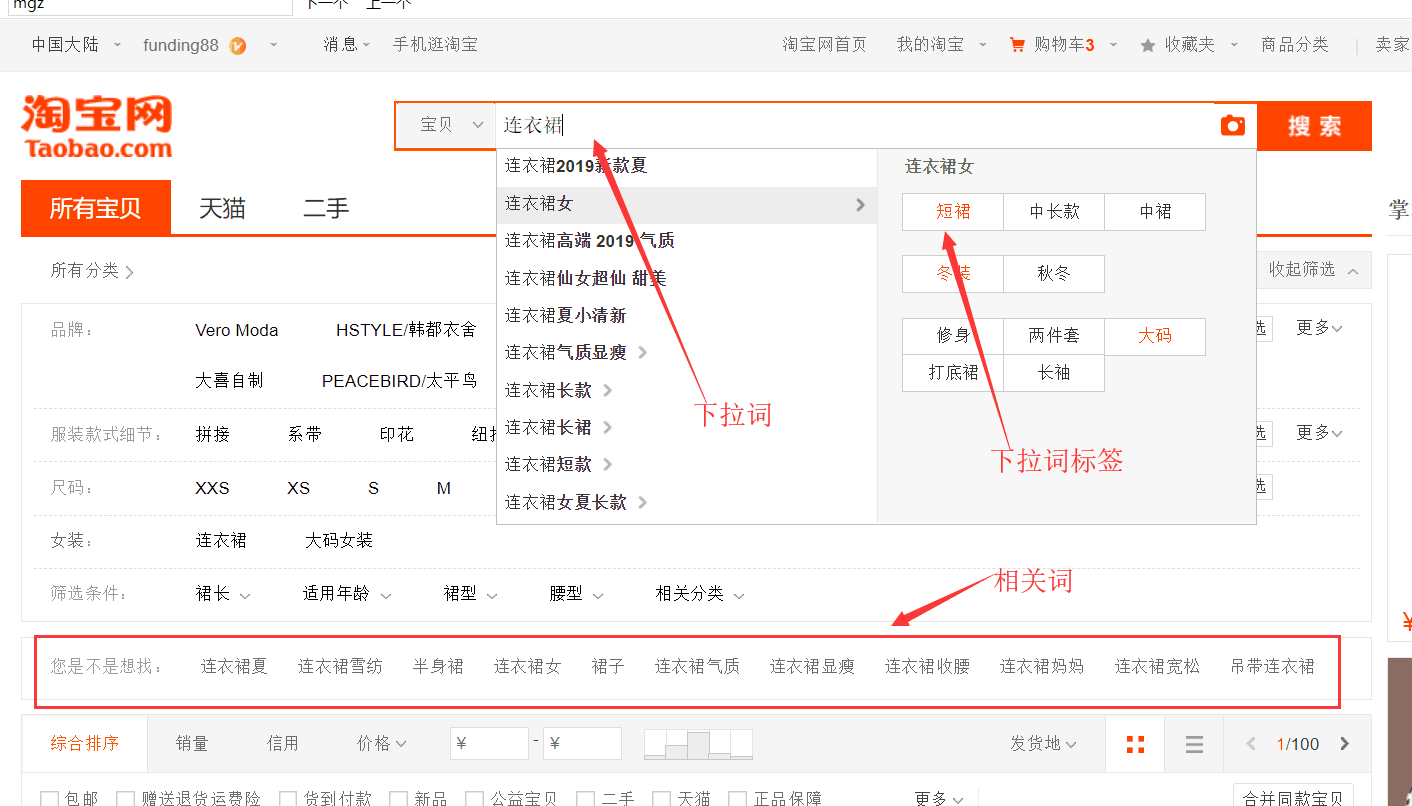 ▼下拉词、相关词、标签具体是指搜索页面上哪些地方的词汇,请看下面截图