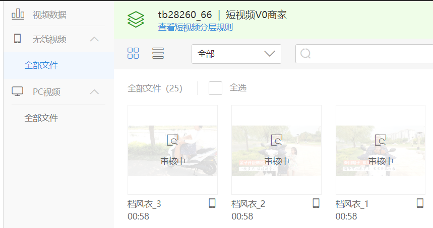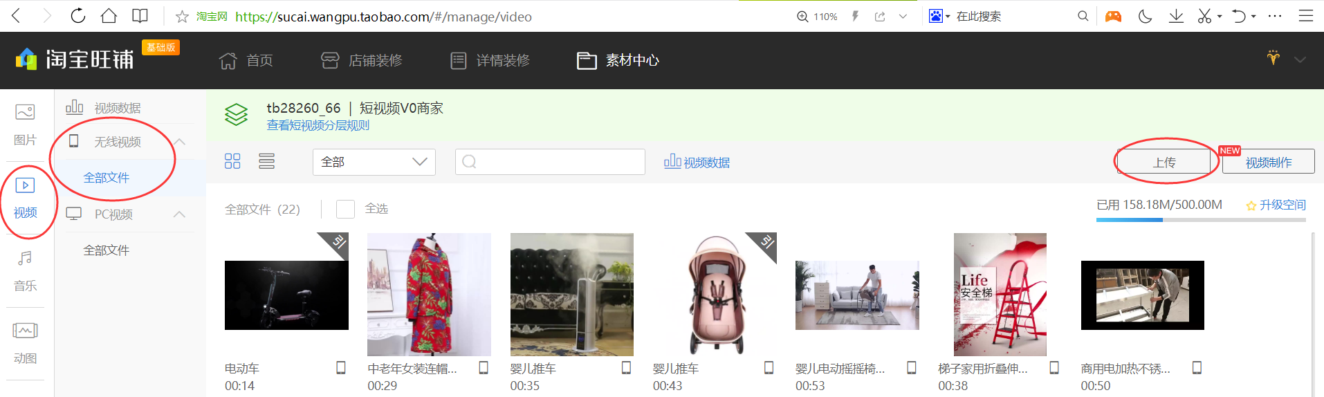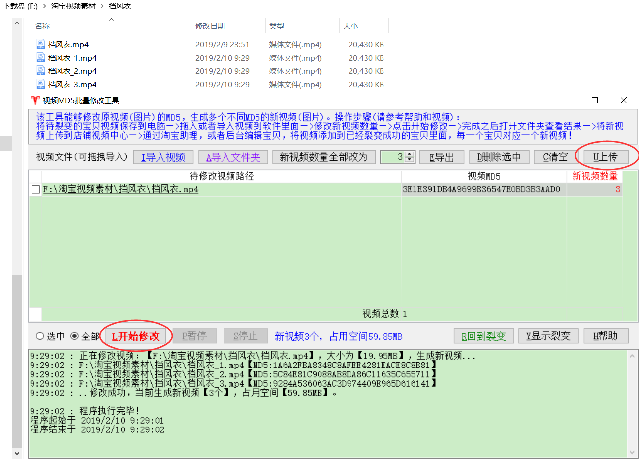 ▼修改新视频数量—>点击开始修改,生成几个新视频,点击软件右上角的“上传”,跳转到淘宝店铺后台视频中心—>无线视频—>全部文件—>点击右上角的“上传”
