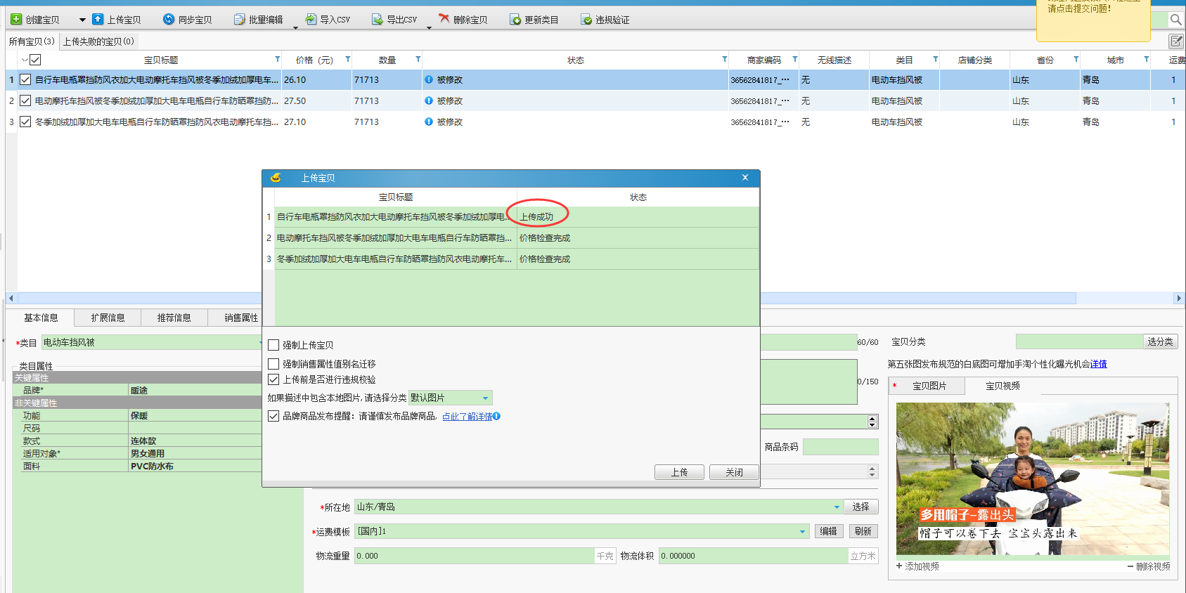 ▼视频分配好之后,点击上传宝贝,这样每个裂变的宝贝应对一个不同MD5值的新视频,视频裂变操作完成