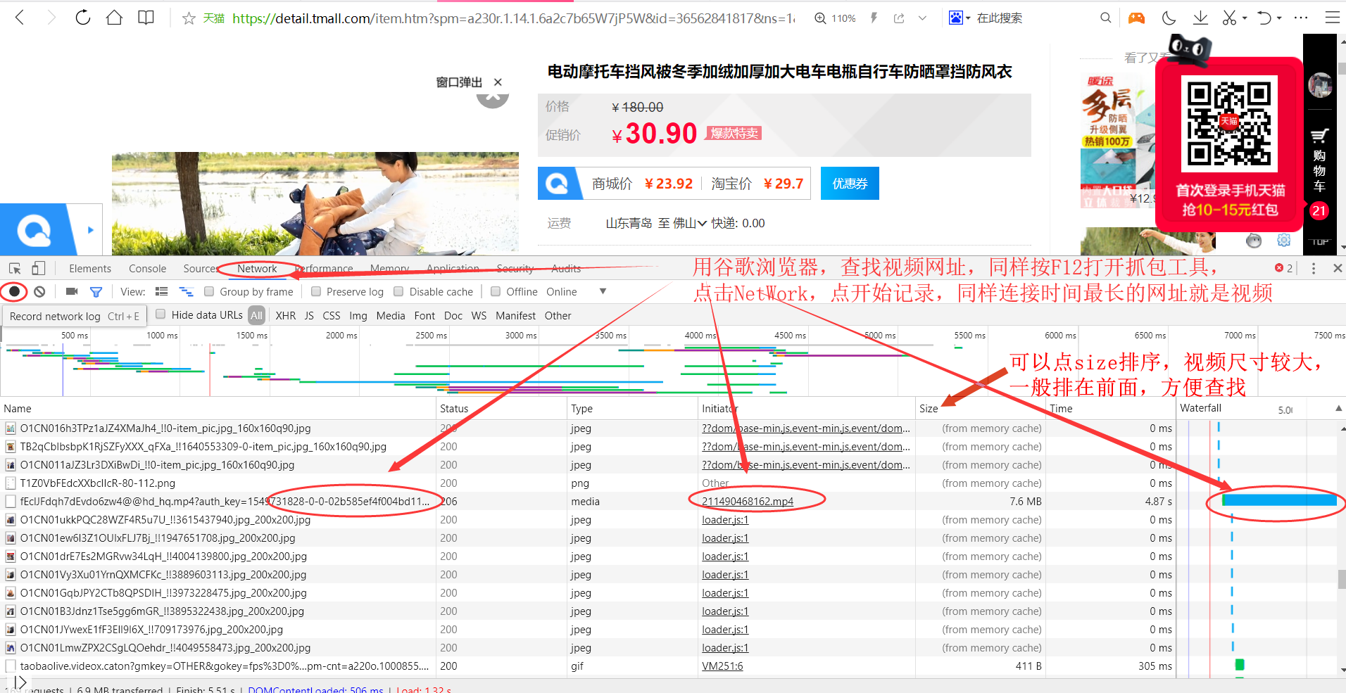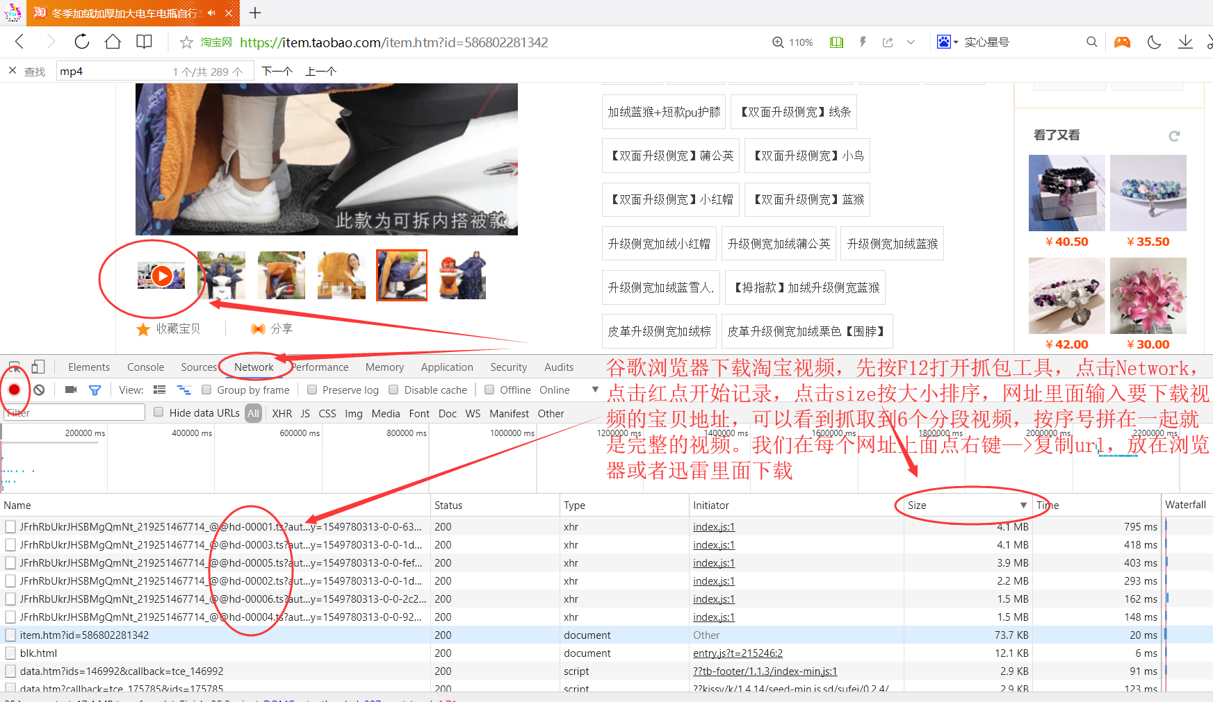 谷歌浏览器下载淘宝视频,先按F12打开抓包工具,点击Network,点击红点开始记录,点击size按大小排序,网址里面输入要下载视频的宝贝地址,按Enter键打开网页,可以看到抓取到6个分段视频,按序号可以拼成一个完整的视频。我们在每个分段视频网址上面点右键—>Copy—>copy link address,放在浏览器或者迅雷里面下载所有分段视频。
