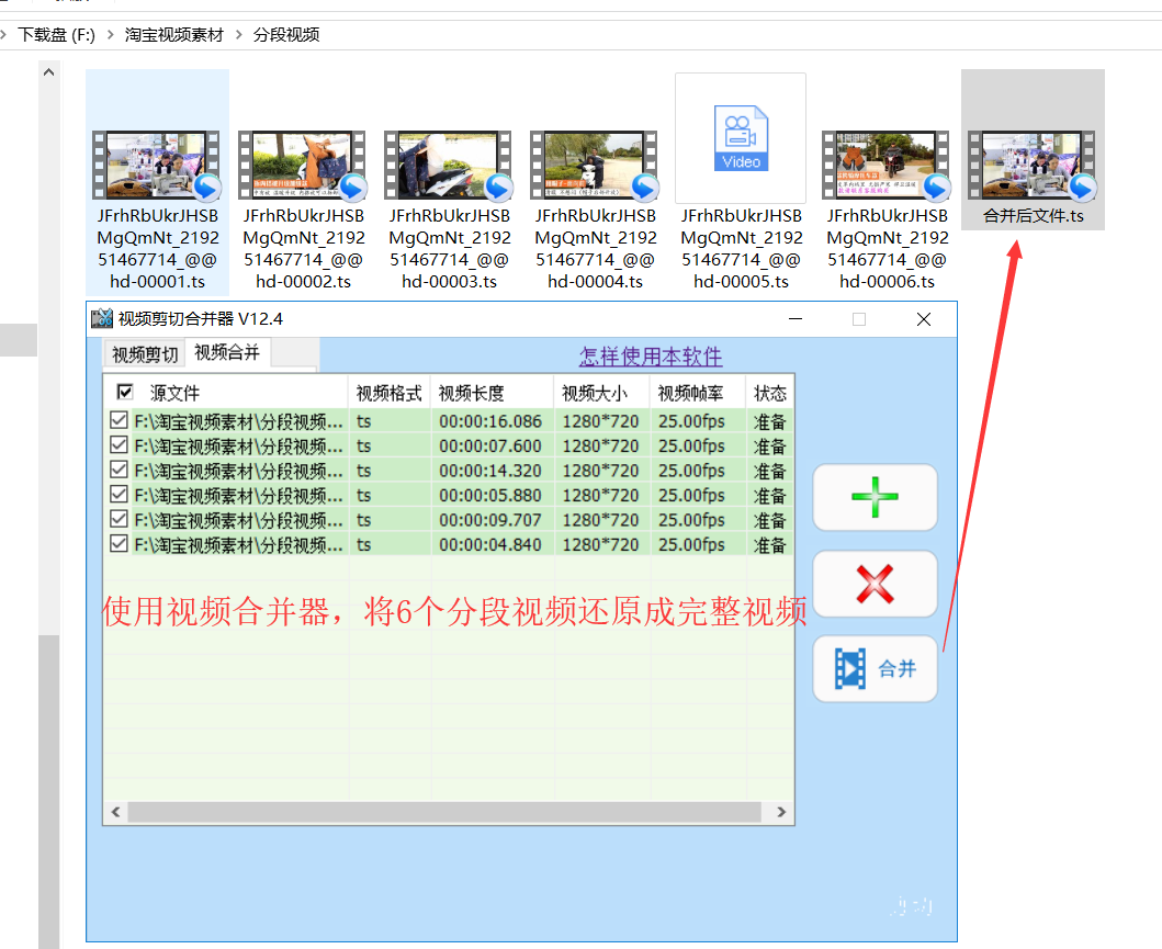 淘宝视频采用分段方式,下载分段视频之后,需要合并还原成完整视频才能使用。