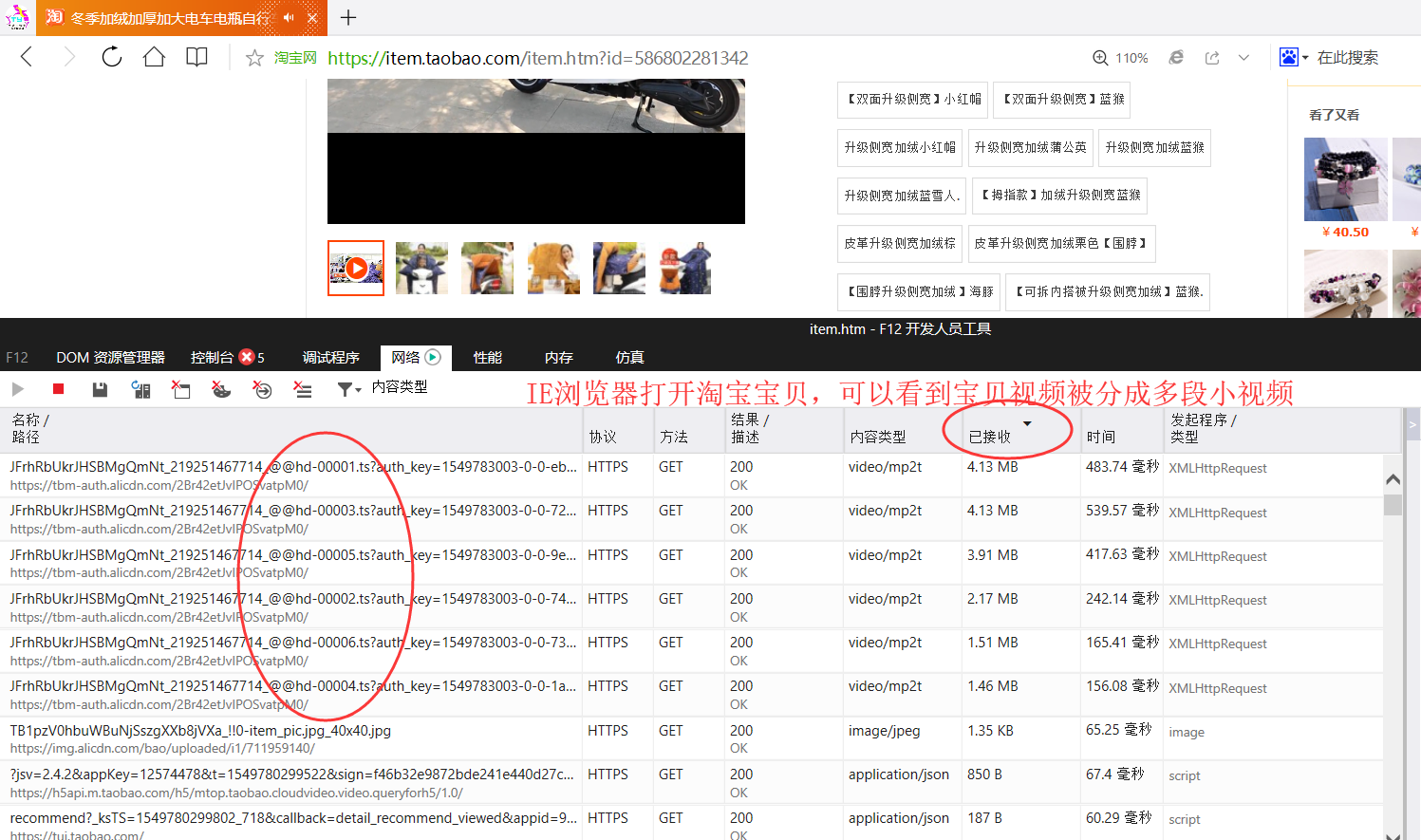 IE浏览器打开淘宝宝贝,相似操作,也可以看到宝贝视频被分成多段小视频,在每个视频链接上面点右键—>复制URL,下载到电脑里面。