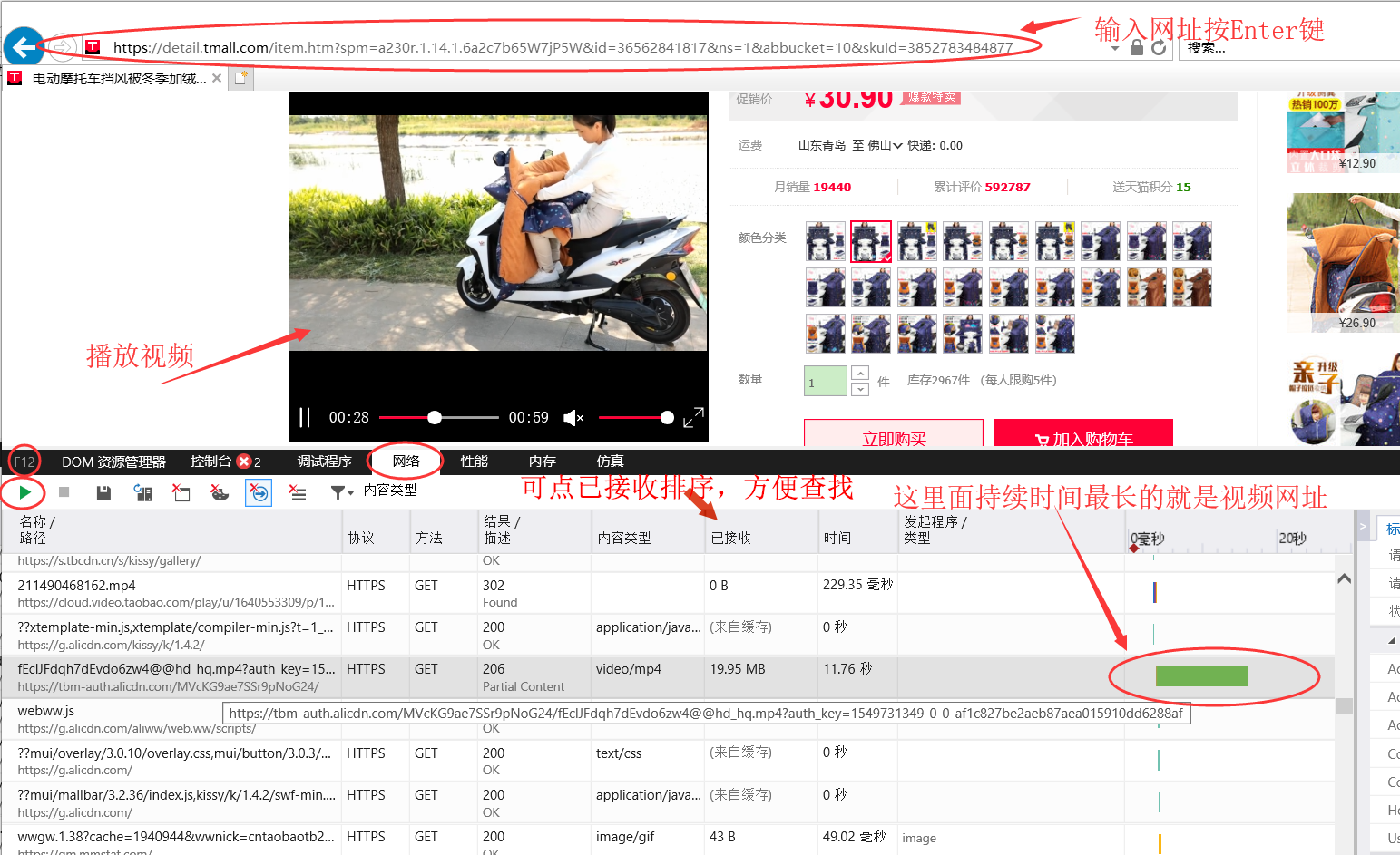 用谷歌浏览器查找视频网址,同样按F12打开抓包工具,点击Network,点击里面第一个按钮record network log开始记录,在浏览器里面输入宝贝的网址按Enter键打开,播放一下视频。从上到下查看网址,同样可以看到访问时间最长的是视频的网址