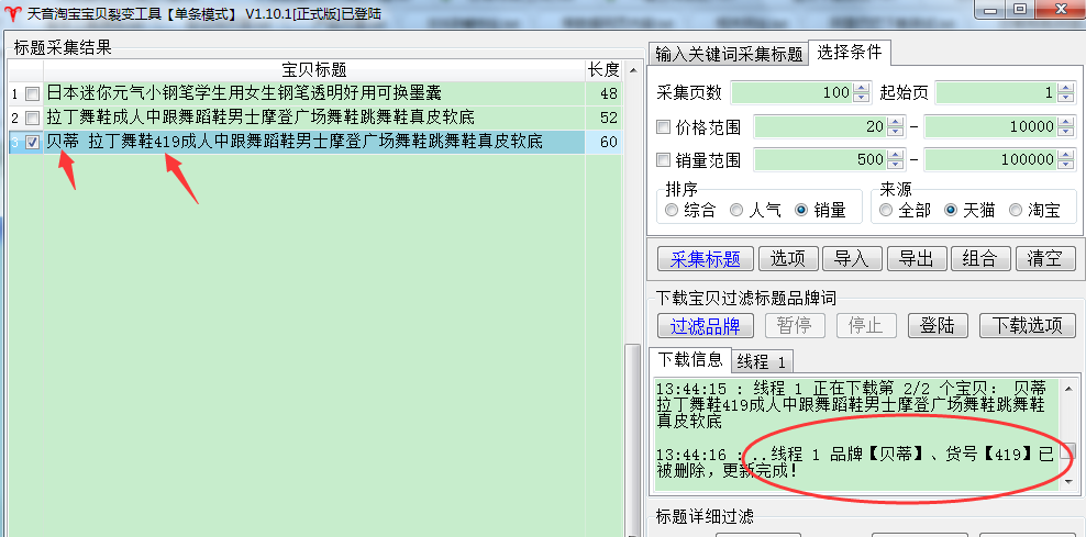 ▼勾选了这两个功能,点击过滤品牌,可见标题里面的品牌和货号一起被过滤了