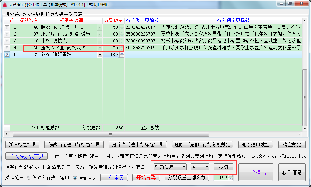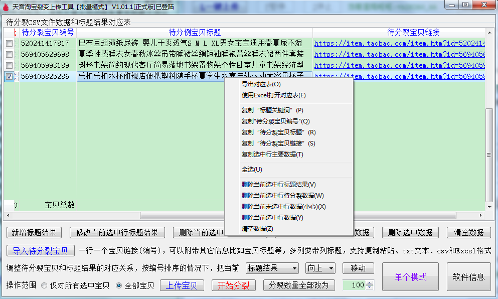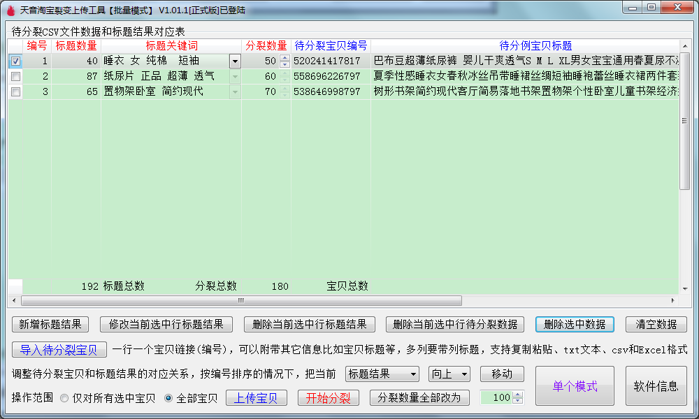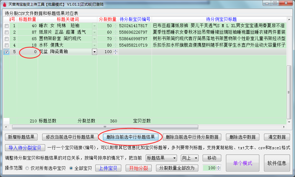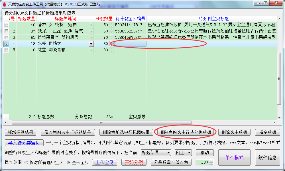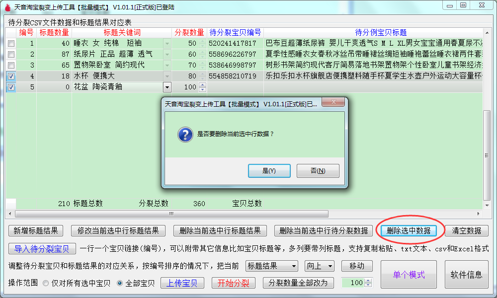 ▼删除选中数据:支持多选删除,会把标题结果和待分裂宝贝一起删除,相当于把对应表的数据进行删除;