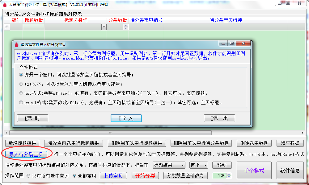 ▼操作顺序:首先往对应表里面导入待分裂宝贝,比如我们使用弹出窗口添加链接方式