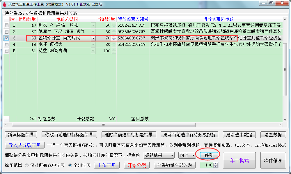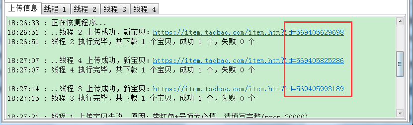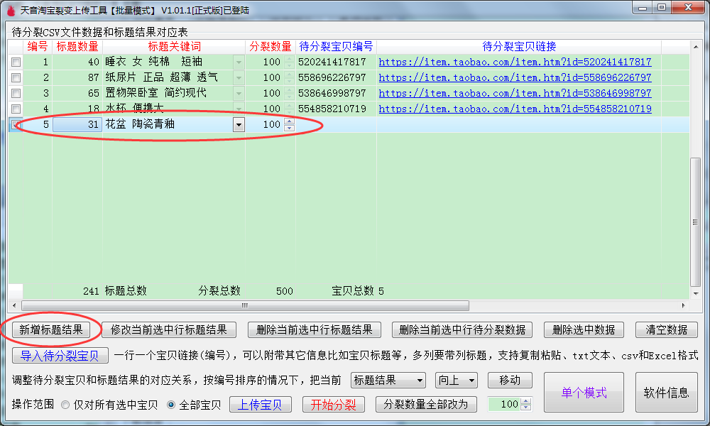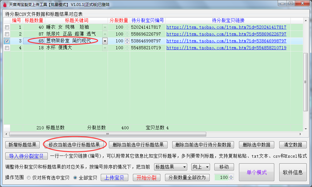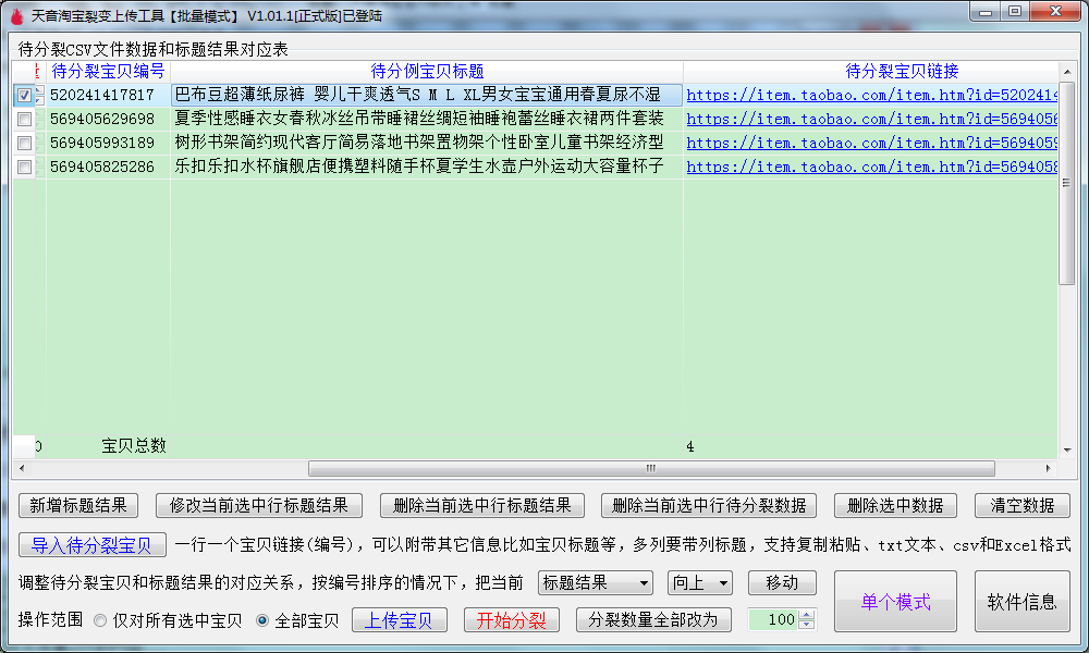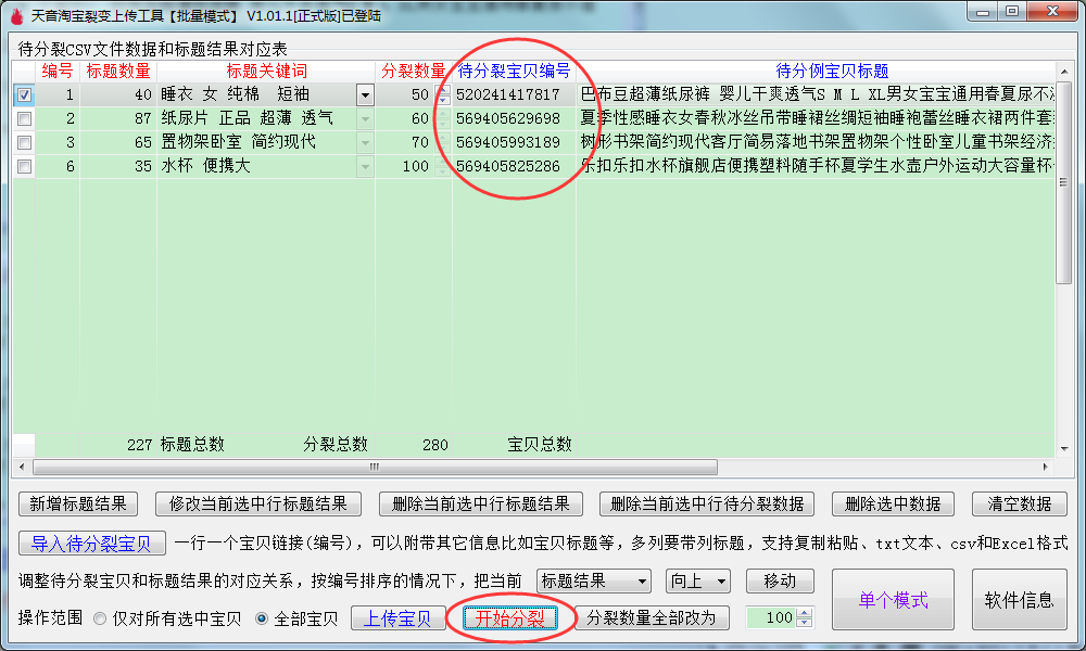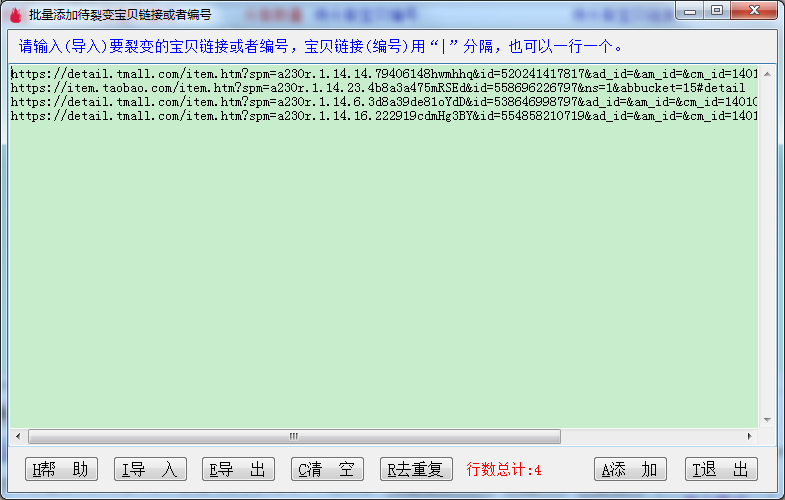 ▼上传成功之后,返回到批量裂变主界面,待分裂编号已经替换成刚刚上传成功本店宝贝的链接。