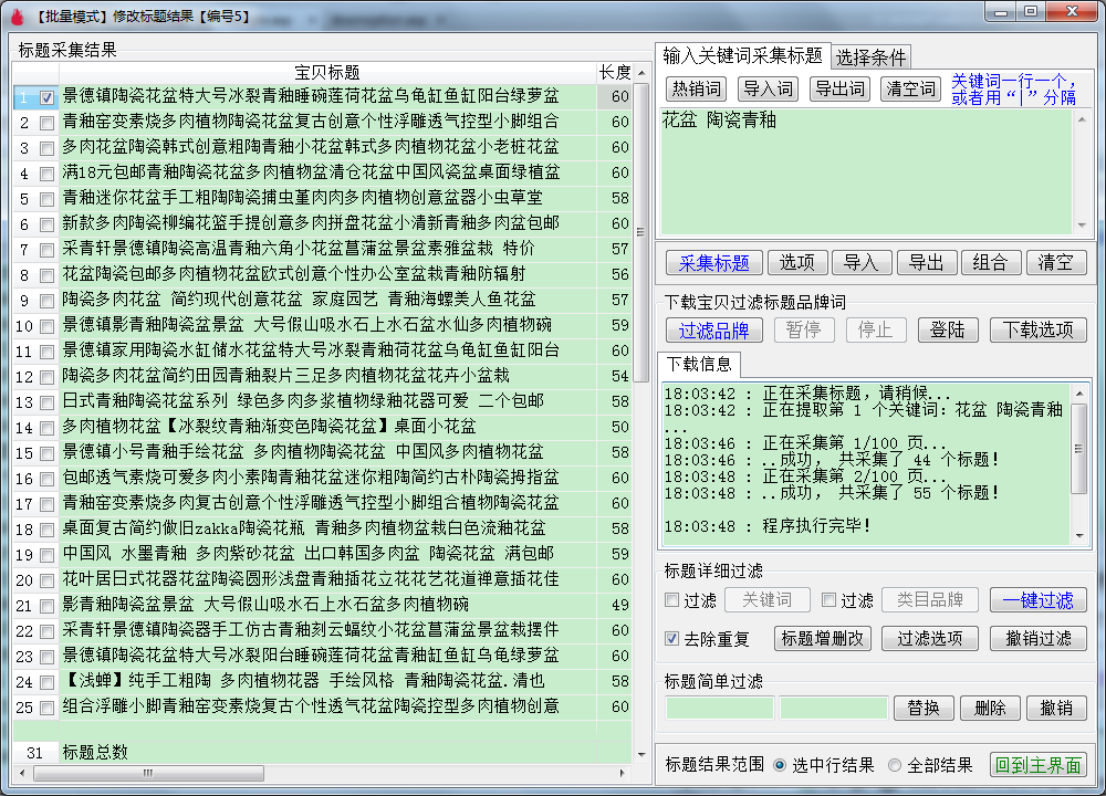 ▼删除当前选中行标题结果,可以把当前选中行的标题数量清零,双击进入就看不到任何标题了,需要重新采集或者导入。