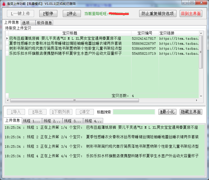 ▼上传宝贝:分裂前,建议先上传待分裂宝贝到自己的店铺,可以选择其它几个宝贝上传,也可以全选;上传前可以在上传功能的选项里面把总店宝贝的价格调高。