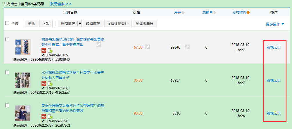 ▼接下来可以去淘宝后台—>出售中的宝贝,检查修改每个待分裂宝贝的信息,比如说去掉描述推荐窗口等。