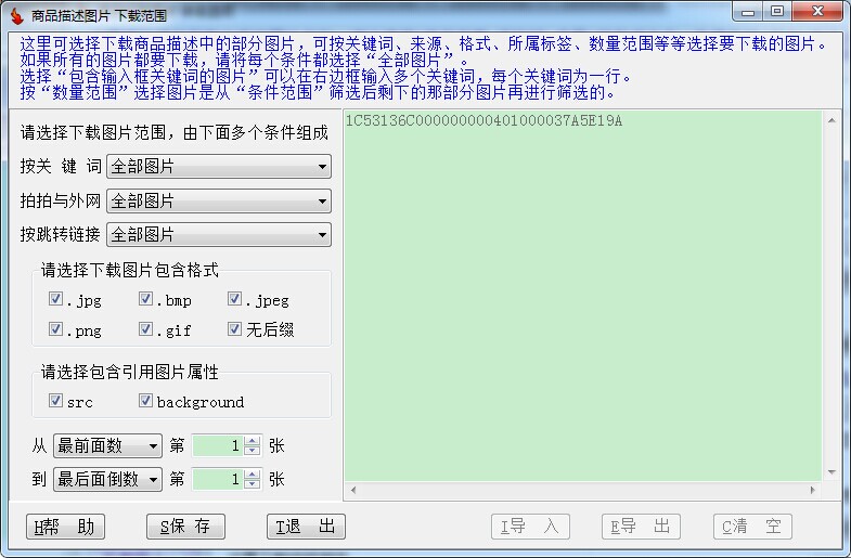 遇到已经存在的图片不再重复下载:重复图片可分为两种情况,第一是指同一个商品的重复图片,比如图片[1.jpg]在[商品1]里面重复出现;第二是指不同商品的重复图片,比如图片[1.jpg]分别在[商品1]、[商品2]出现。该选项是指第二种情况,至于第一种情况,下载过程会自动跳过重复图片。