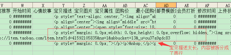 CSV文件每条宝贝信息都是单独占一行,无论这一行有多长,有的宝贝描述很长,但是Excel做不到在一行里面把信息完整的显示出来,它会把信息分成多行显示,这就是我们看到数据错乱的效果。