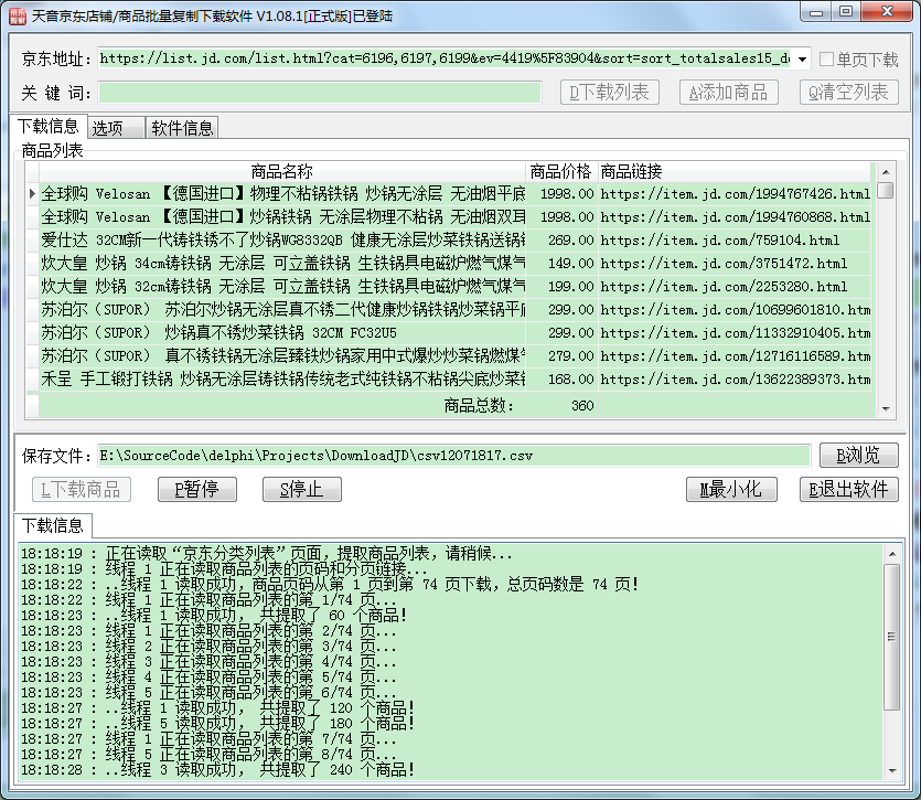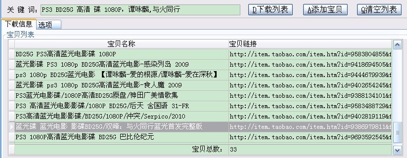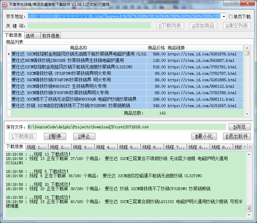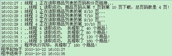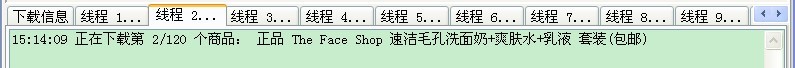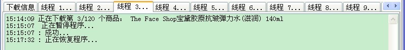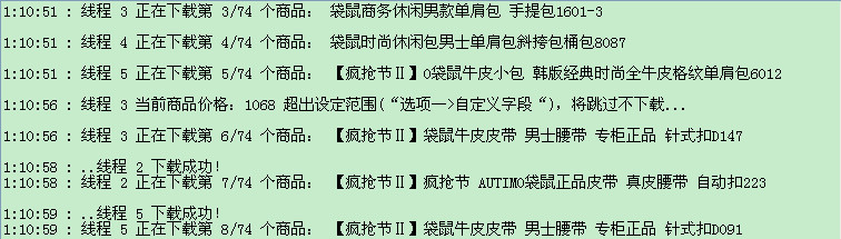 下载列表和下载商品这两个过程都使用多线程抢占方式,即先完成的线程继续下载下一页(个),加快下载速度,点击相应的线程页面可查看下载的情况。另外,“选项”里面可以设置下载的线程数、重试次数、超时时间。