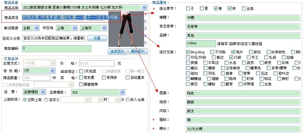 下载类目下所有属性自动搜索匹配方式:V2.27以前的版本保留下来的,首先下载当前商品所属类目下的所有属性,有了详细属性的数据库,当前商品的每个属性值可通过自动搜索匹配的方式获得,所有属性值组合在一起成为最终的结果。目前这种方式准确率接近100%;缺点是:下载商品详细信息之前需要先下载类目下所有的属性,下载速度较第①种方式慢,效率较低。之所以目前还保留这种方式,是因为第①种方式拍拍限制比较多,目前不是很稳定,作为后备使用。