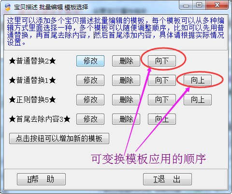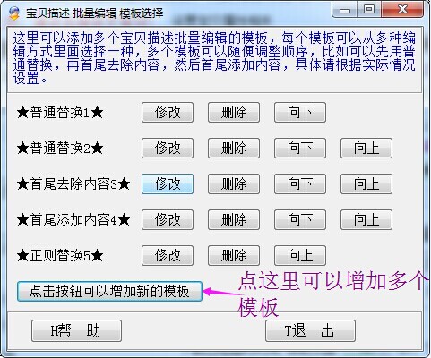这里可以添加多个宝贝描述批量编辑的模板,每个模板可以从多种编辑方式里面选择一种,多个模板可以随便调整顺序,比如可以先用普通替换,再首尾去除内容,然后首尾添加内容,具体请根据实际情况设置。