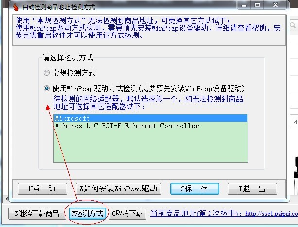 “使用WinPcap驱动方式检测”默认是不可选择的,原因在于使用这种方式需要预先安装WinPcap设备驱动,驱动的下载地址和安装步骤详细请点击查看,安装完毕请关闭再打开拍拍下载软件即可选择。
