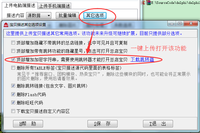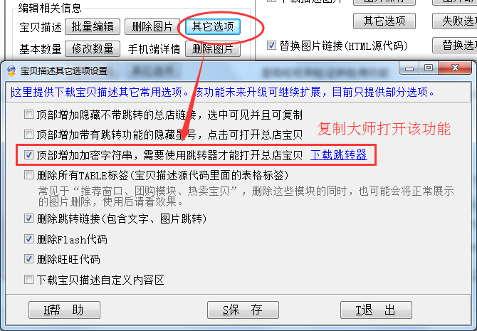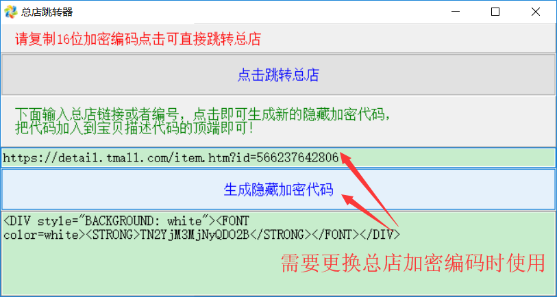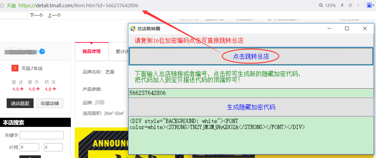 总店链接跳转器,请复制宝贝描述顶部16位隐藏的加密编码,打开跳转器,点击按钮即可跳转到总店,如下图所示,